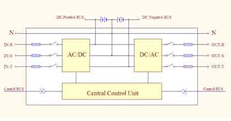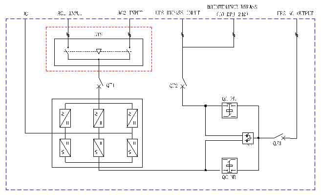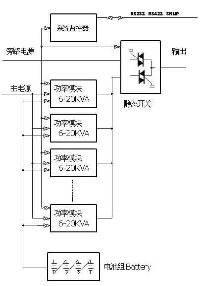 系統(tǒng)為模塊式結(jié)構(gòu),由靜態(tài)開關(guān)模塊、系統(tǒng)監(jiān)控模塊和1到24個功率模塊并聯(lián)組成。